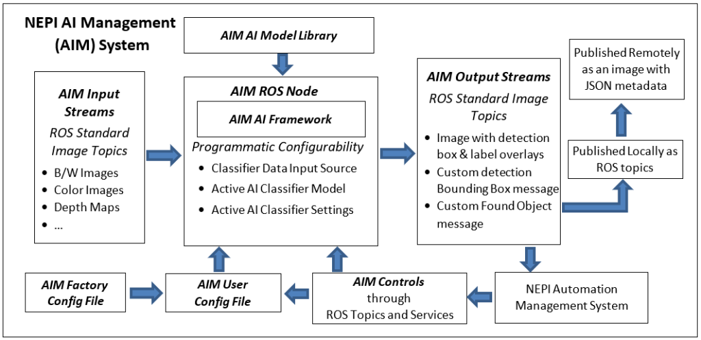 At the heart of NEPI's AIM system is an image classification AI framework wrapped in a custom ROS node and configuration management system. The AIM system works with pre-trained AI detector models stored in an on-board library of installed AI detector models. The AIM system manages AI detector model startup and setup based on a configuration file, as well as in-situ AI detector data input and settings configuration through set of ROS services as illustrated the figure below.