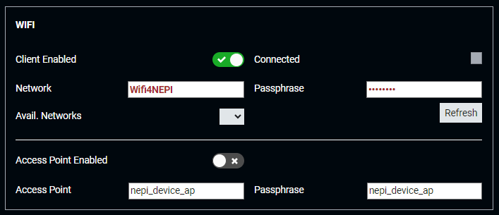 2) Open your NEPI device's RUI "System/Device" tab, enable WiFi Client connection, find the newly create mobile hotspot access point in the "Avial. Networks" dropdown box