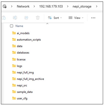 Enter the system IP address and data folder in your file explorer window's address bar (e.g., \\192.168.179.103\nepi_storage). You will be prompted for a username and password. After entering credentials, you should see the subdirectories listed above. You can drag/drop, copy/paste locally, or delete files.