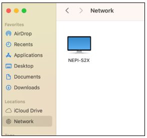 Open the Finder application and select the Network open on the left access bar. You should see you NEPI device listed. Click on the NEPI device and enter the username and password provided at the beginning of this section.