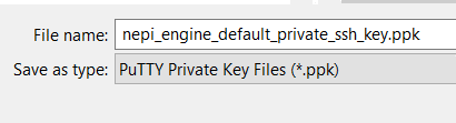 f) From the save popup window, enter the following file name to save your new Putty compatible ssh key as "nepi_engine_default_private_ssh_key.ppk", and click the "Save" button, and hit "Yes" in the popup window.