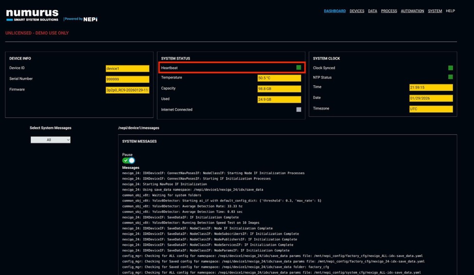You should see the NEPI RUI dashboard page appear and a blinking Green heartbeat indicator at the top of the SYSTEM STATUS section that lets you know that the RUI is communicating with the NEPI backend software processes.