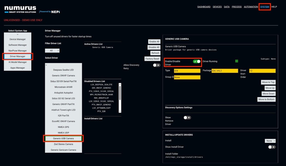 2) Enable the USB Camera driver by navigating: