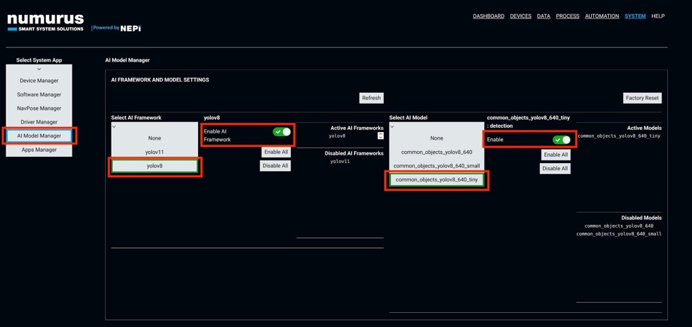 - Enable an installed AI detection model and connect it to the camera feed